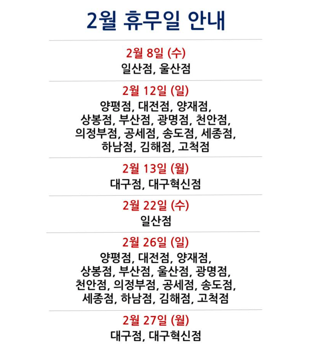 또한 이번달부터 대구점과 대구혁신점 휴무일이 월요일로 변경되어 2월 13일, 27일이 휴무입니다!